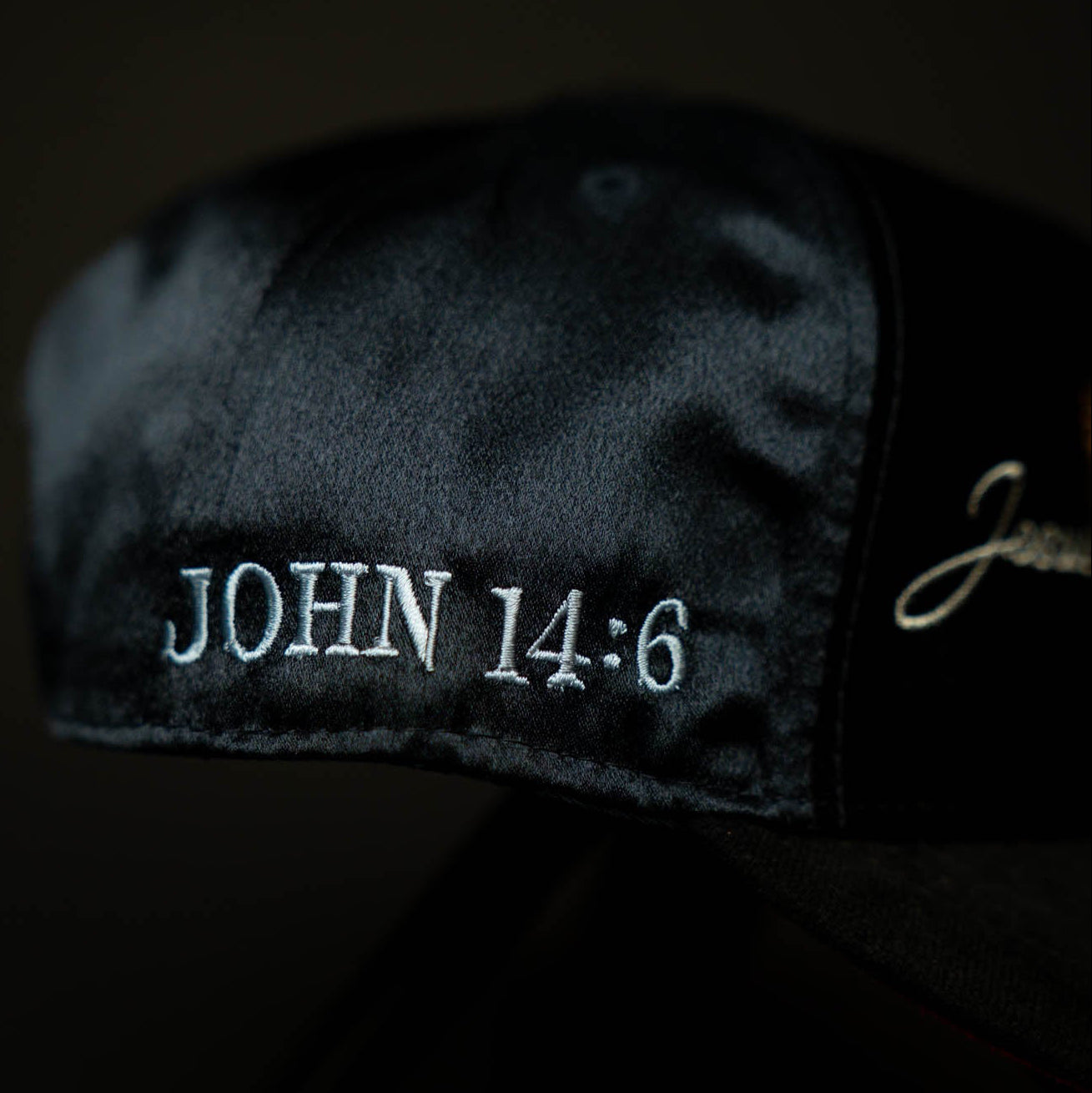 Elevate your faith-based wardrobe with this striking Jesus Christ Hat, featuring premium black satin construction paired with a distinctive red bottom underbrim. The design incorporates John 14:6—"I am the way, the truth, and the life"—a powerful scriptural reference that speaks to your spiritual convictions. The contrasting red underbrim adds visual depth while the quality satin material ensures durability and a refined appearance. Perfect for believers seeking meaningful accessories that reflect their devotion, this hat combines thoughtful design with wearable theology